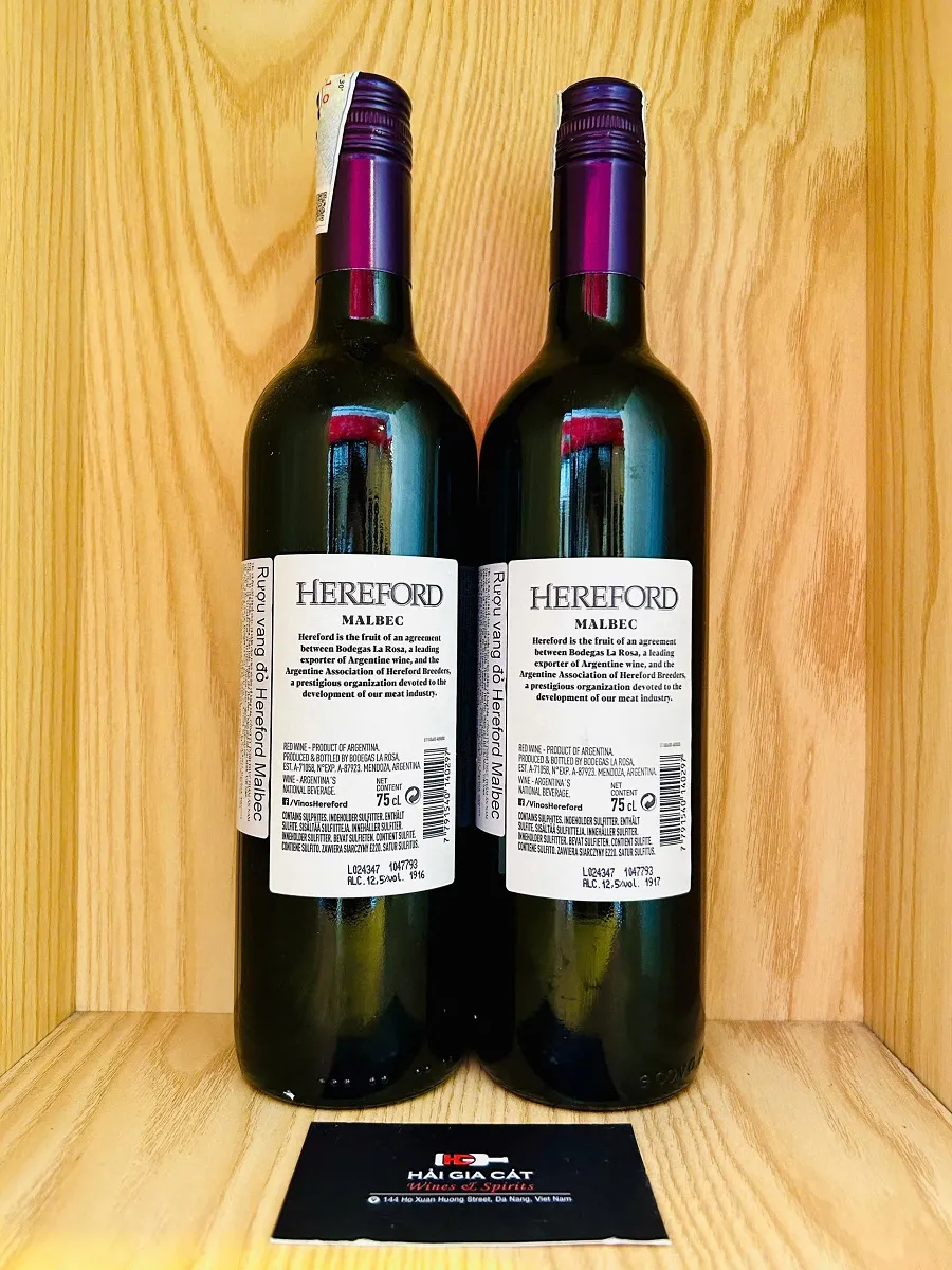 Rượu vang Hereford Malbec là một loại rượu vang đỏ trứ danh đến từ vùng Mendoza ở Argentina. Được làm từ giống nho Malbec nổi tiếng, loại rượu vang này mang đến hương vị phong phú, đầy đặn và những nốt hương hấp dẫn của trái cây chín mọng. Tên Hereford được đặt để vinh danh giống bò Hereford nổi tiếng, gắn liền với lịch sử và văn hóa của vùng đất này.